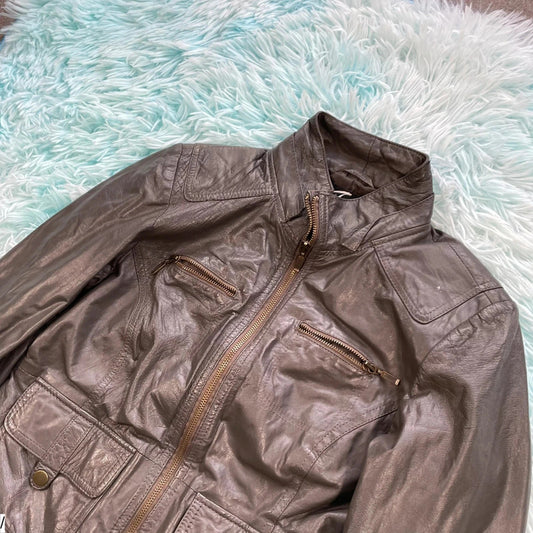 Vintage 00s Y2K Brown Leather Jacket Fitted - Size 12