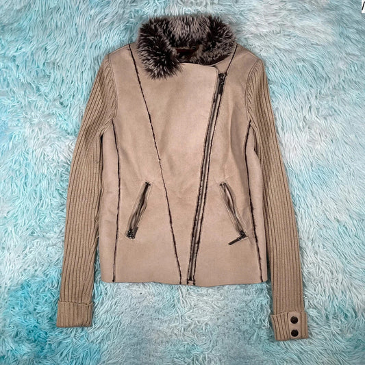 Vintage Y2K Beige Rocha Suede Fur Leather Jacket - Size 10