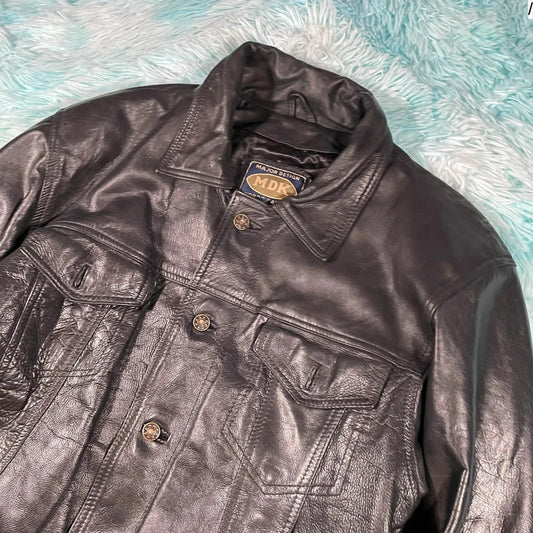 Vintage 90s Black Leather Jacket Trucker - Medium