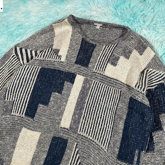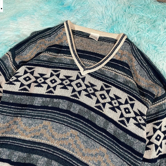Vintage 90s Navy Funky Patterned Knitted Jumper - Medium