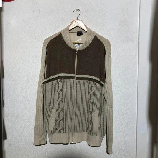 Vintage Beige & Brown Knitted Jumper Full Zip Grandad Jumper - Large