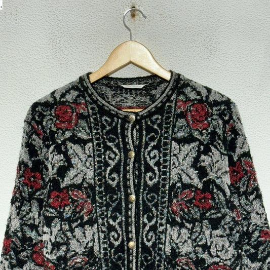 Vintage 80s Black Floral Patterned Knitted Cardigan