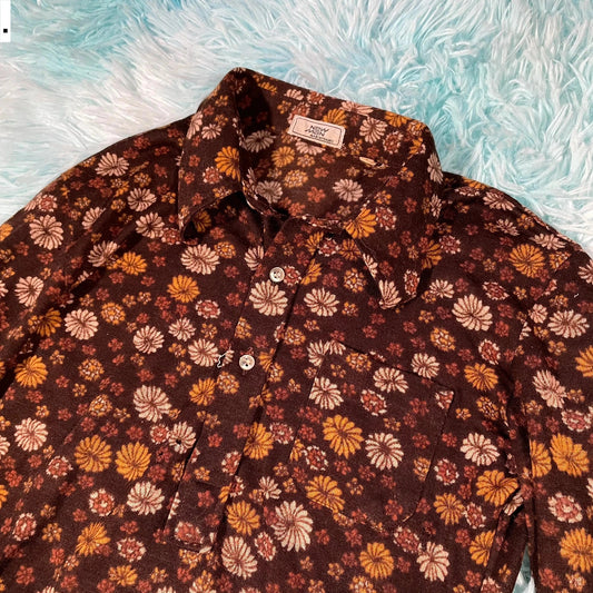 Vintage 70s Brown Floral Shirt Tergal New Man - Size 8