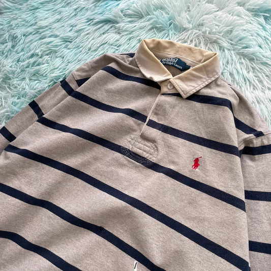 Vintage Grey & Navy Polo Ralph Lauren Rugby Shirt - Large