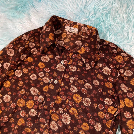 Vintage 70s Brown Floral Shirt Tergal New Man - Size 8