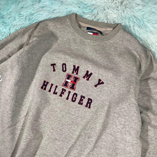 Vintage Grey Tommy Hilfiger Sweatshirt Embroidered Spellout - Large