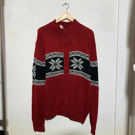 Vintage Red Patterned Snowflake Knitted Jumper Full Zip - Large