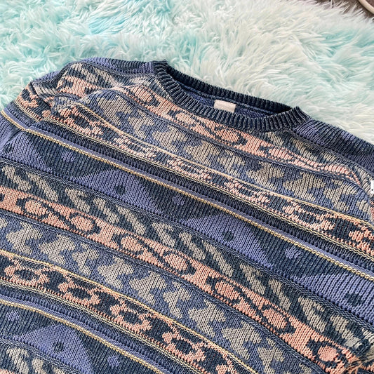 Vintage 90s Blue Funky Patterned Knitted Jumper - Size 12