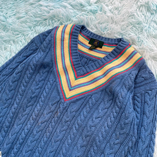 Vintage 90s Blue Cable Knit V Neck Jumper - Small