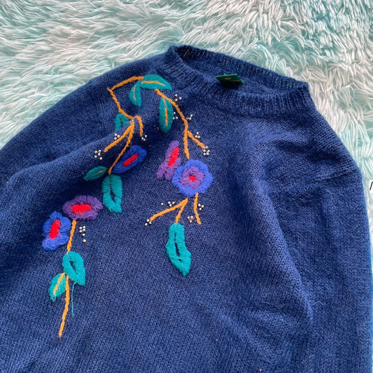 Vintage 90s Navy Canda Knitted Jumper Floral - Size 14