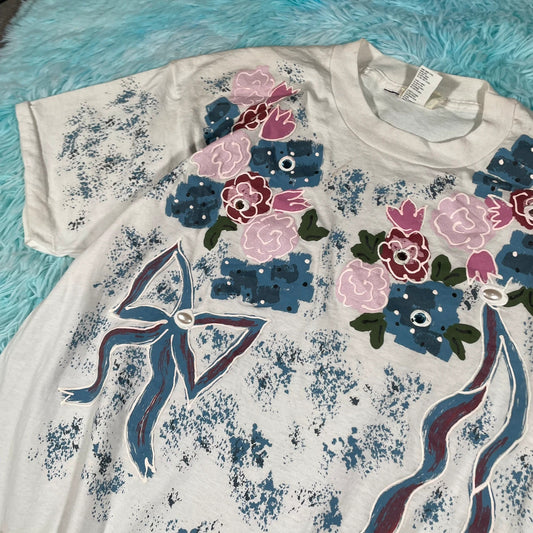 Vintage 90s White Floral Graphic T Shirt - Large