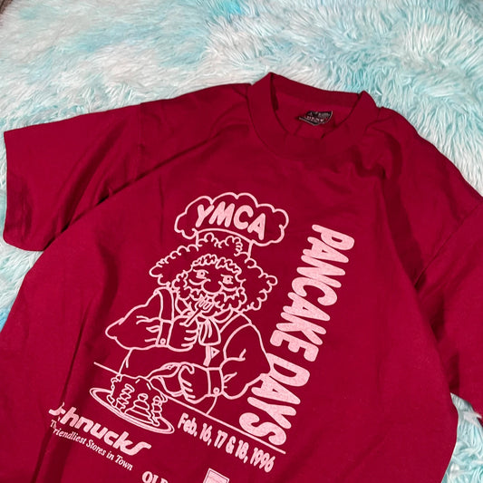 Vintage 90s Maroon Pancake Day YMCA Graphic T Shirt - Large