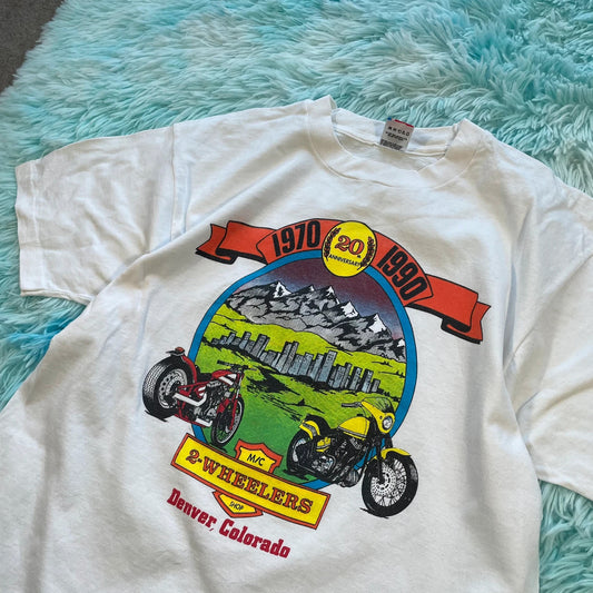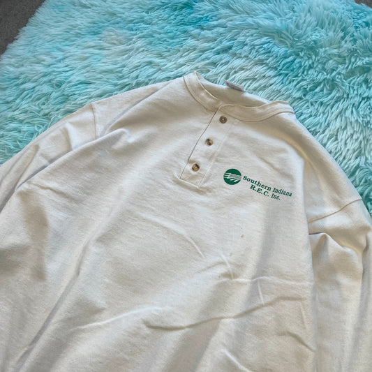 Vintage 90s Beige Henley T Shirt Company graphic - Large