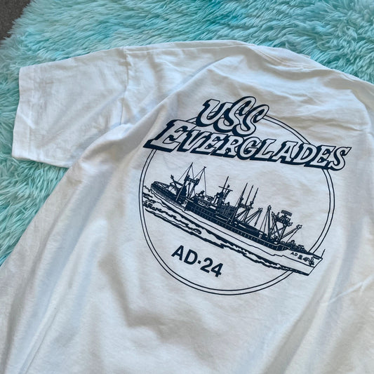 Vintage 90s White USS Everglades Ship Graphic T Shirt - XL