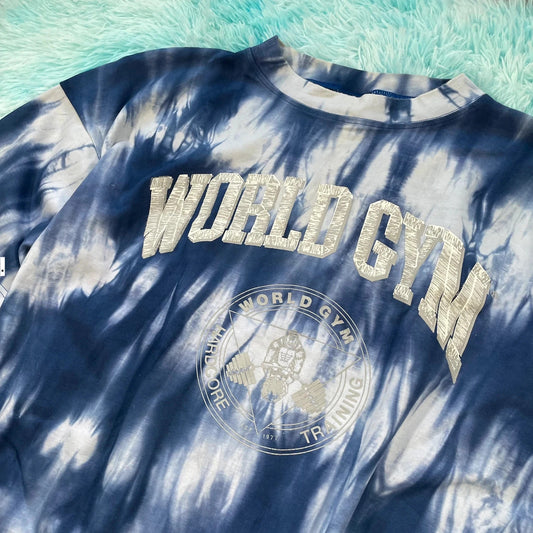 Vintage 90s Blue Tie Dye World Gym Graphic T Shirt - Large