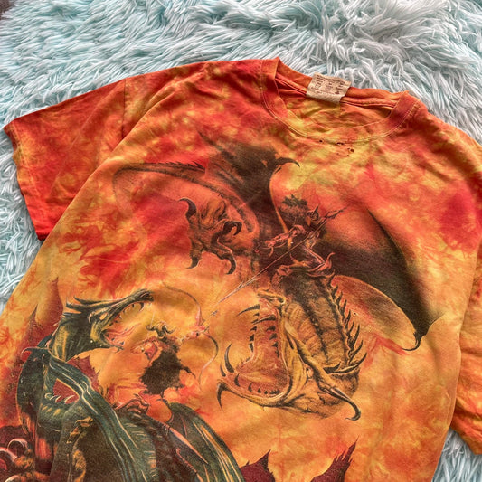 Vintage Orange & Yellow Tie Dye Dragon Graphic T Shirt - Large