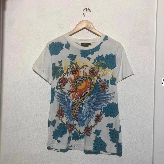 Vintage 00s White & Blue Christian Audiger T Shirt Bedazzled Snake Print - Medium