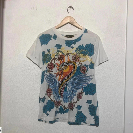 Vintage 00s White & Blue Christian Audiger T Shirt Bedazzled Snake Print - Medium