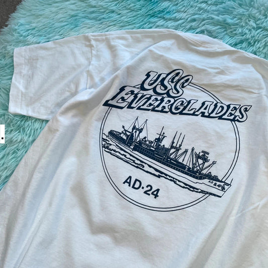 Vintage 90s White USS Everglades Ship Graphic T Shirt - XL