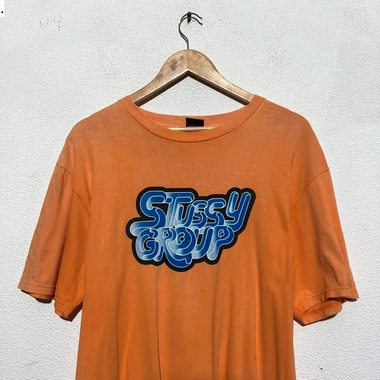 Vintage 90s Orange Stussy Group T Shirt made in USA - Large