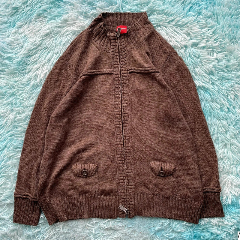 Vintage 00s Brown Olsen Knitted Jumper Full Zip - Medium