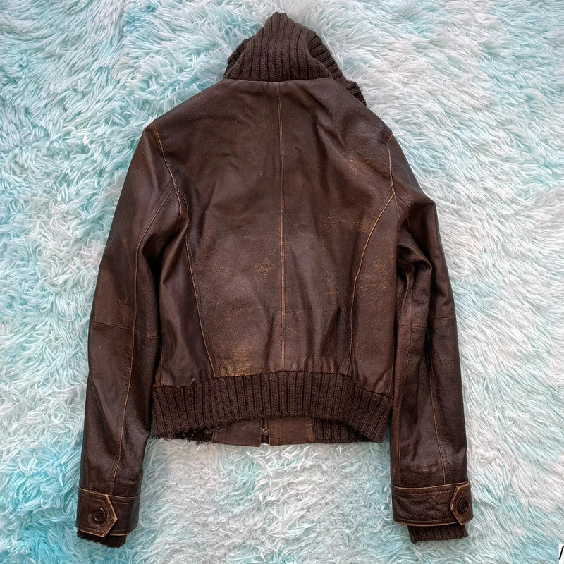 Vintage 00s Y2K Brown Leather Jacket Fitted - Size 12, brand: Dorothy Perkins, condition: Very good, size: 8 / M