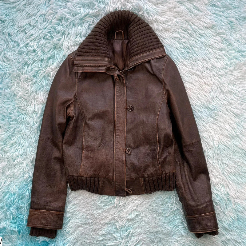 Vintage 00s Y2K Brown Leather Jacket Fitted - Size 12, brand: Dorothy Perkins, condition: Very good, size: 8 / M