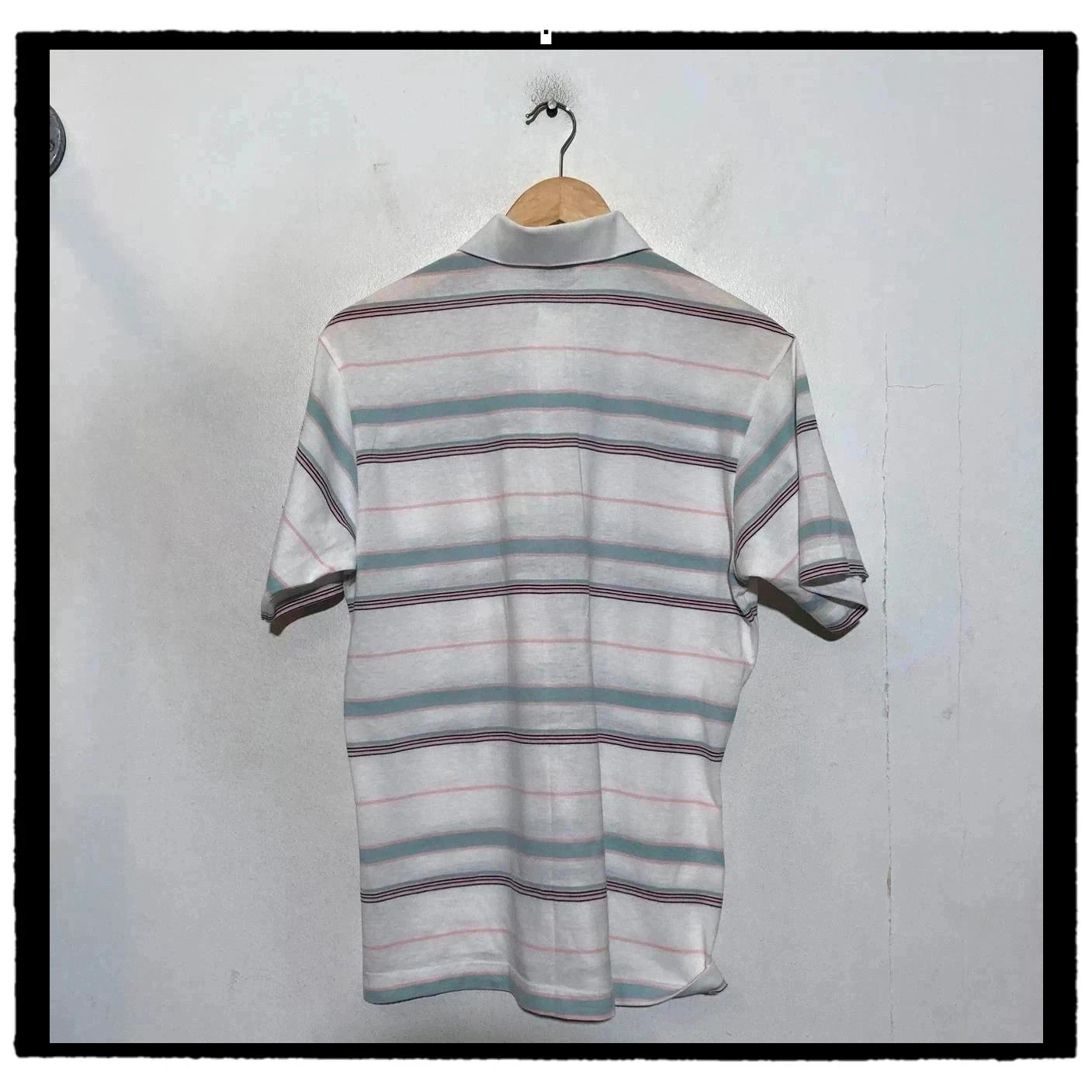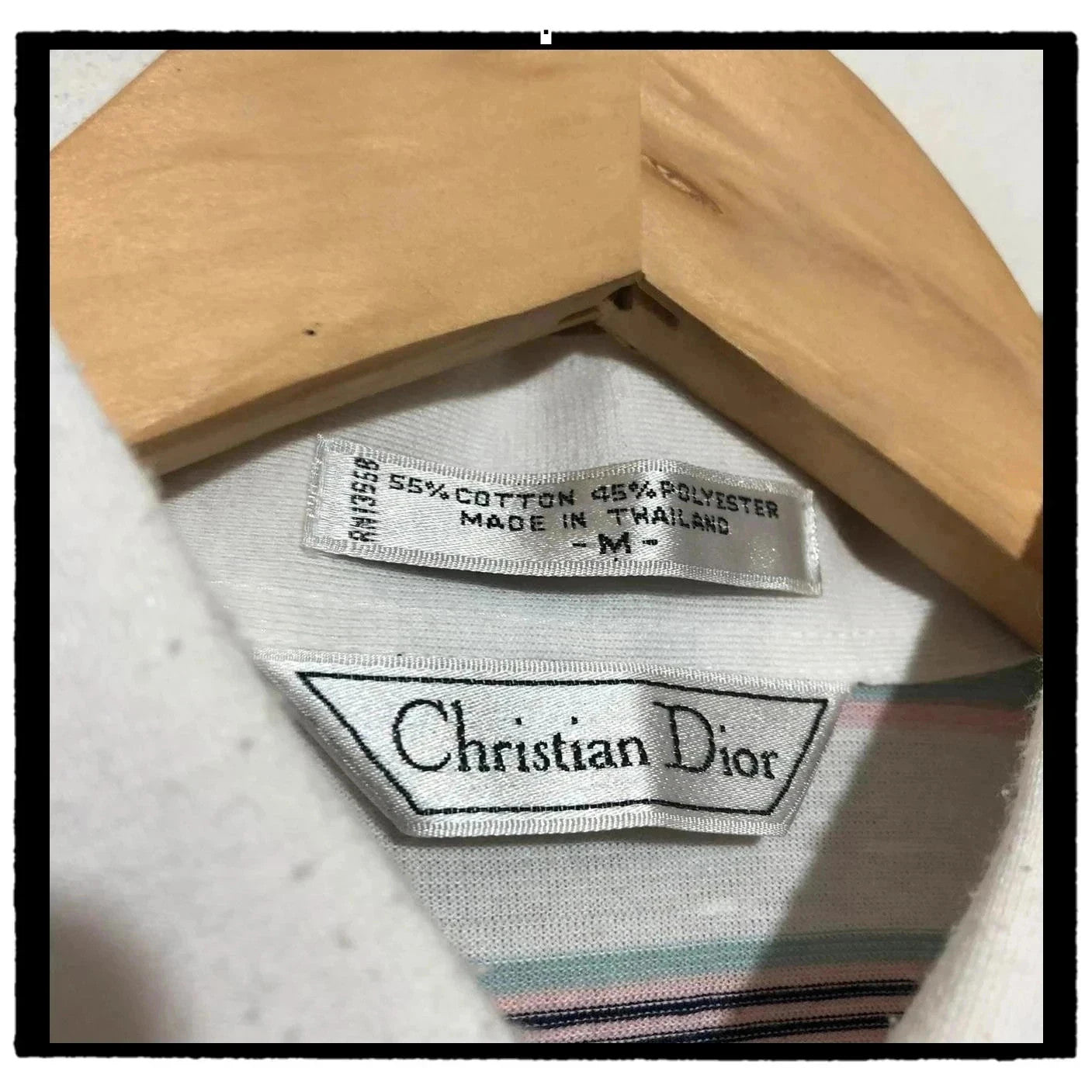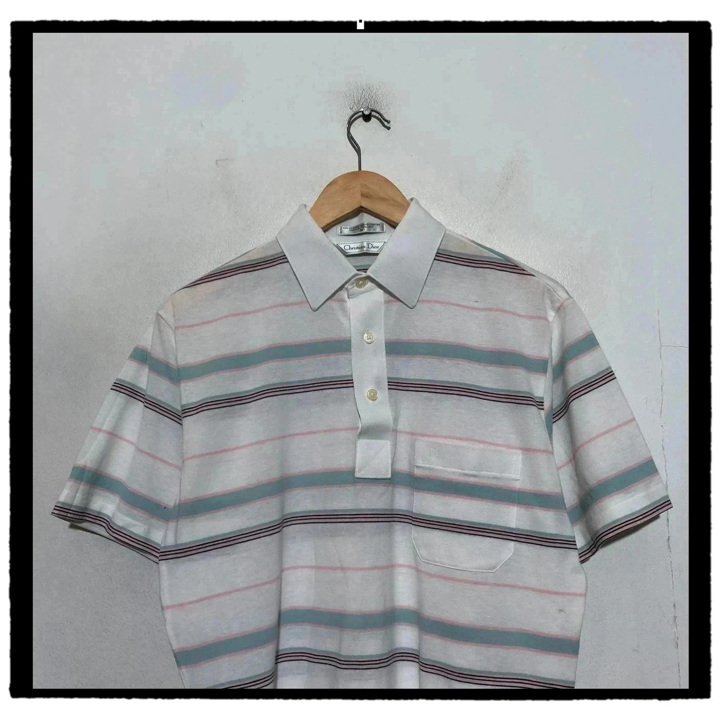 Vintage 80s White & Blue Striped Christian Dior Polo Shirt - Medium