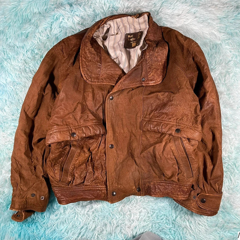 Vintage 90s Brown Leather Bomber Jacket - Medium, brand: NO LABEL, condition: Good, size: M