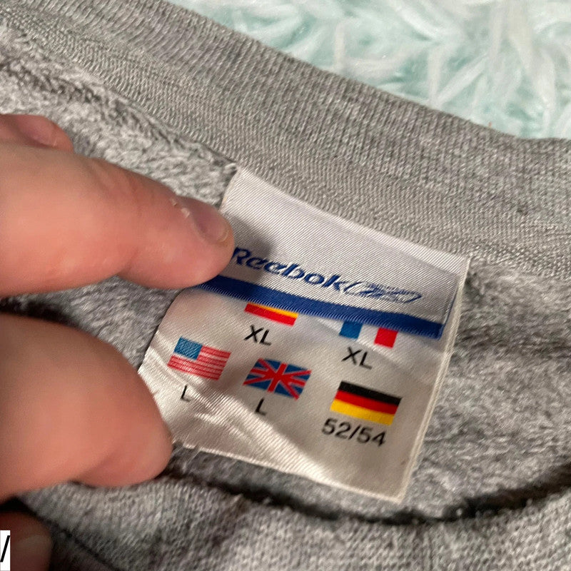 Vintage 90s Grey Reebok Sweatshirt Spellout - Large, brand: Reebok, condition: Good, size: L