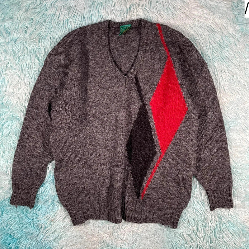 Vintage 90s Grey V Neck Wool Knitted Jumper - Medium
