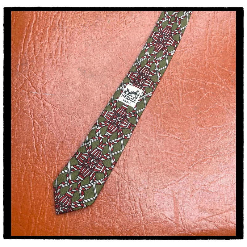 Vintage 90s Hermes Tie Patterned Green Made in France 100% Silk, brand: Hermès, condition: Very good