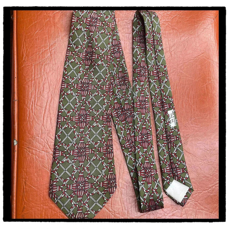 Vintage 90s Hermes Tie Patterned Green Made in France 100% Silk, brand: Hermès, condition: Very good