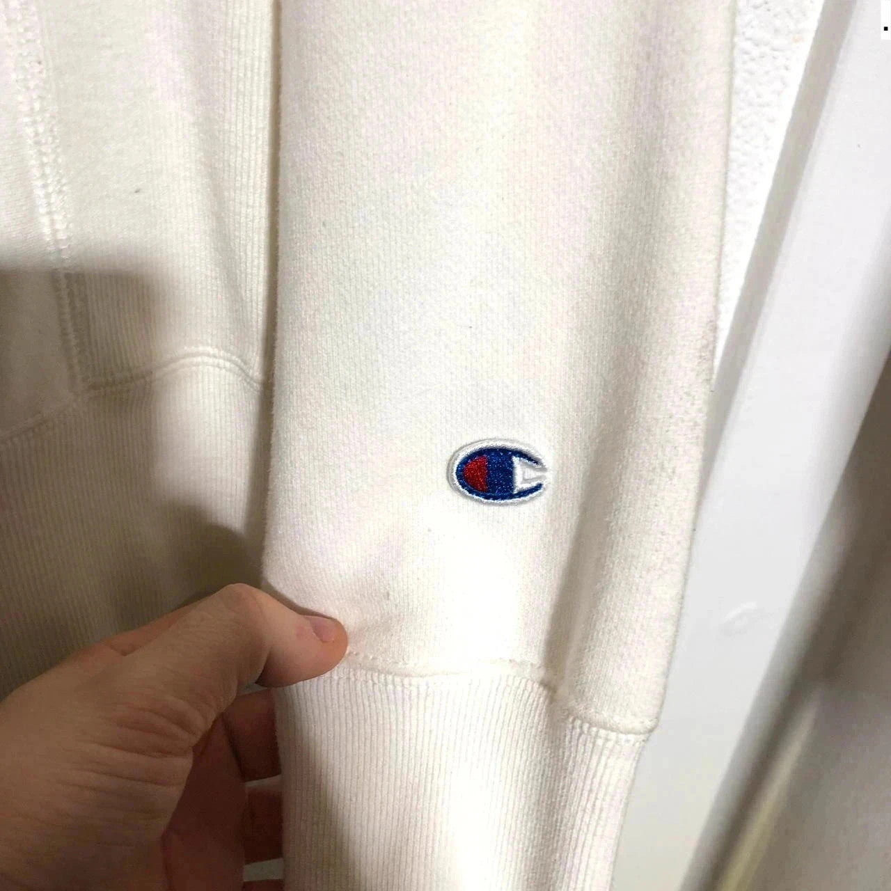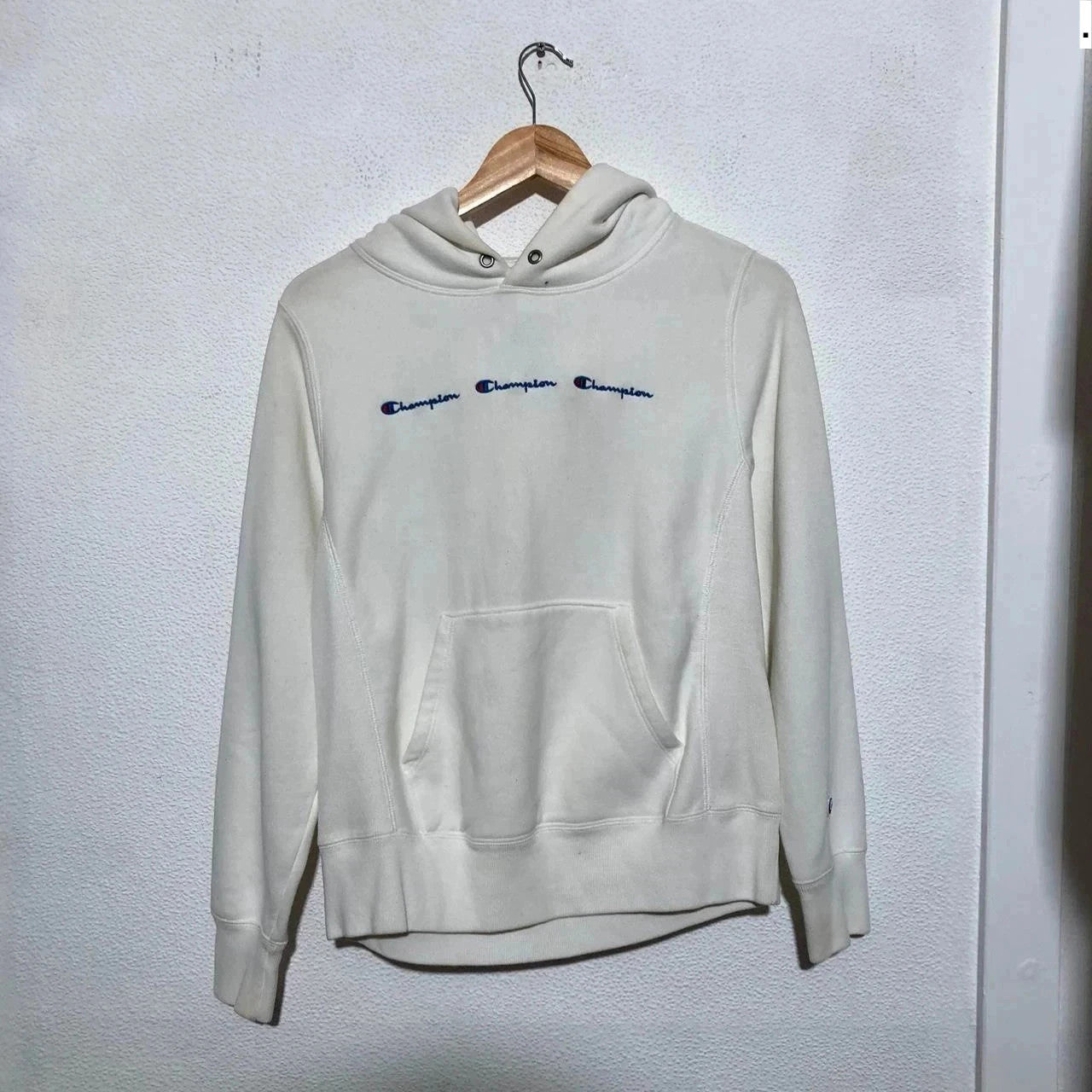 Vintage White Champion Hoodie Triple Spellout Reverse Weave - Small