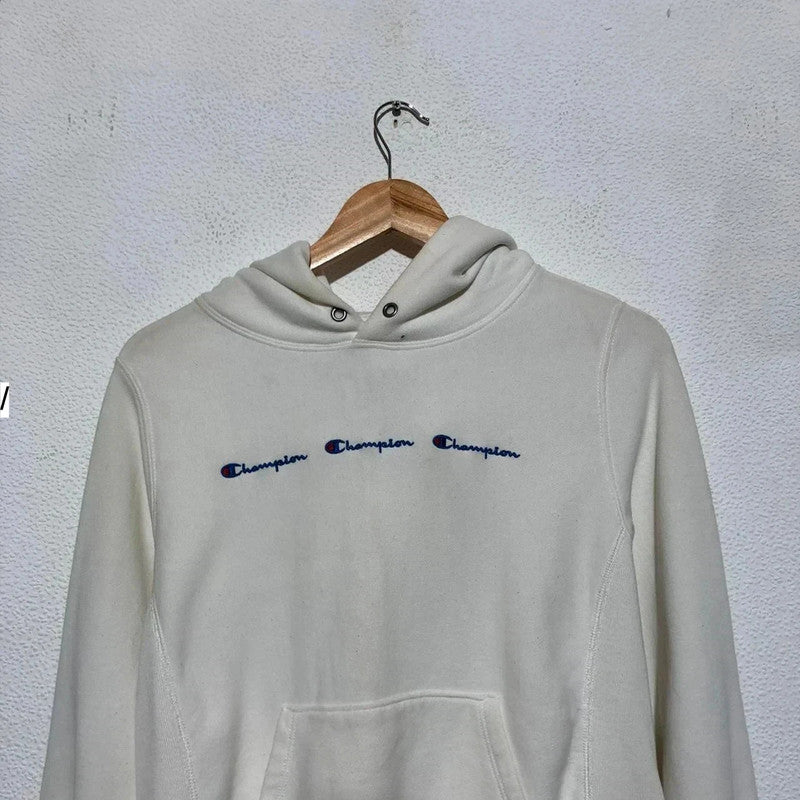 Vintage White Champion Hoodie Triple Spellout Reverse Weave - Small, brand: Champion, condition: Very good, size: S